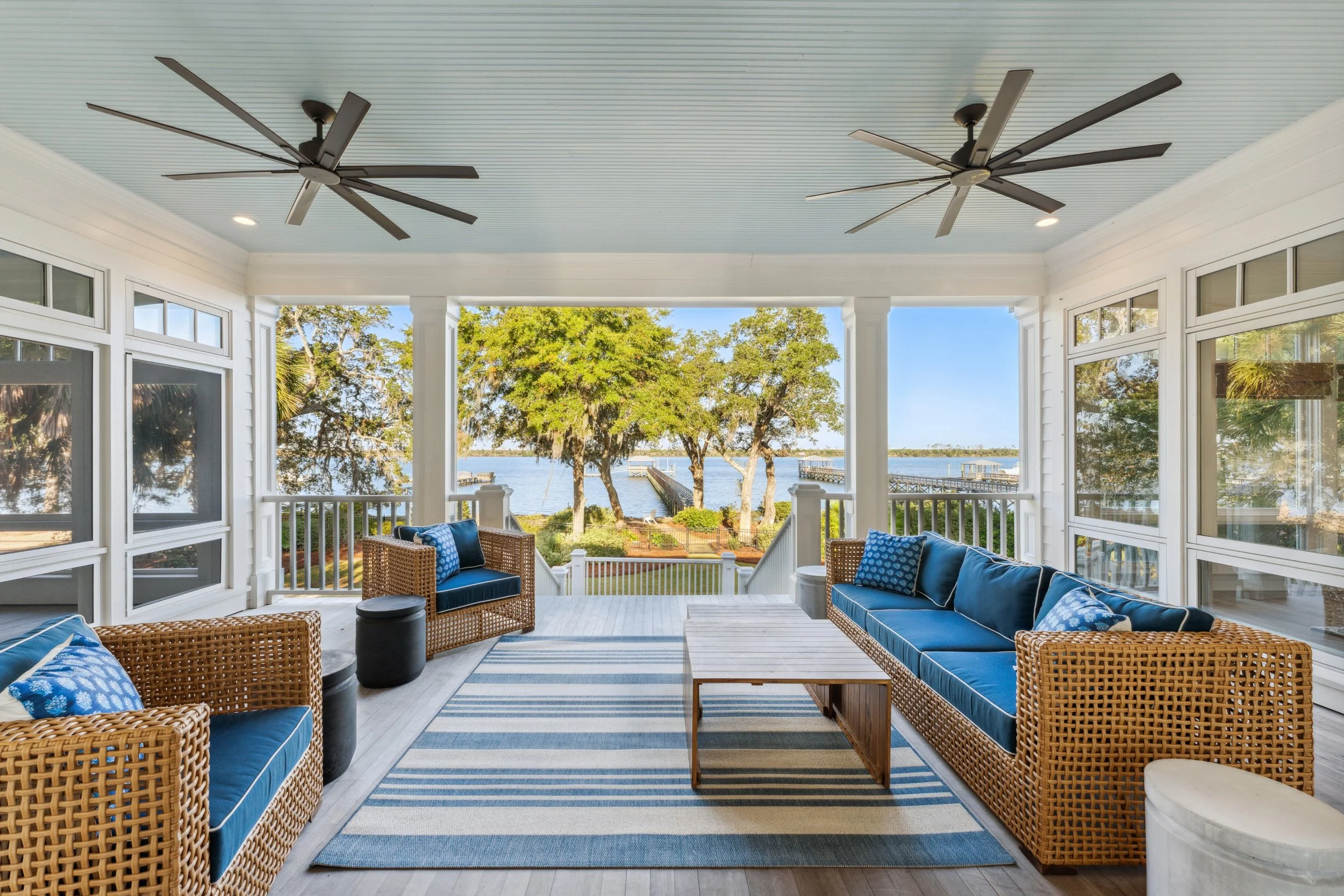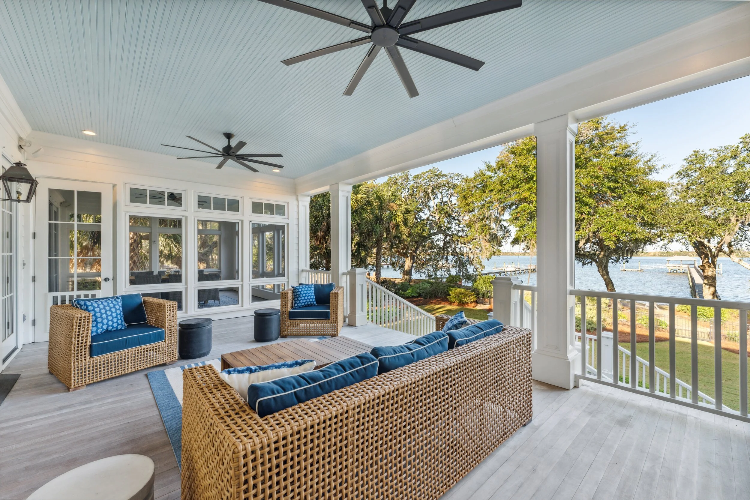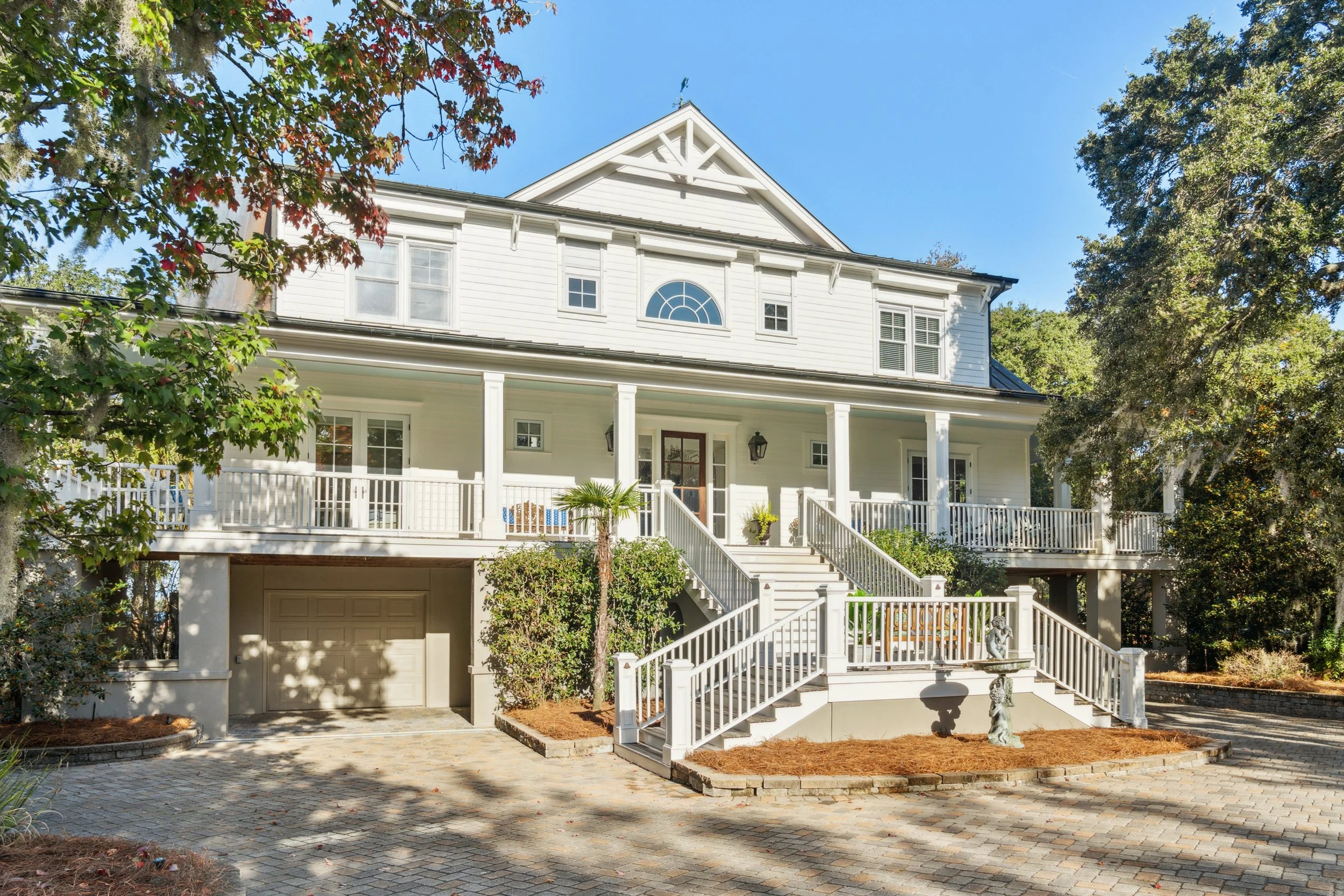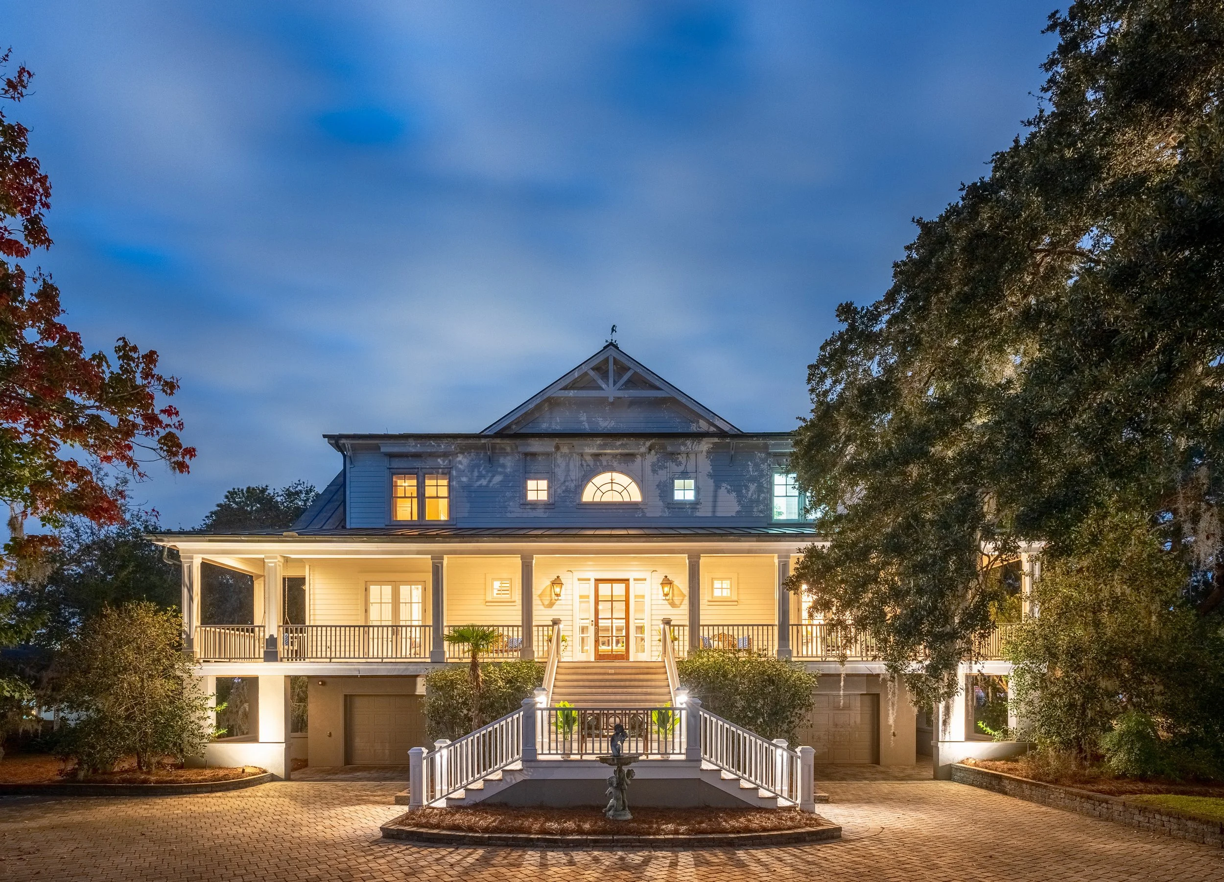 This 5,600+ square foot home features over 80 feet of waterfront on its lot and has a DEEP WATER DOCK! You are greeted by a large circle driveway and mature oak trees - true Lowcountry charm. The large wrap-around front porch is the perfect place to enjoy a porch swing or rocking chairs. The foyer is grand and leads to the living room with water views. Large sliding doors from the living room lead to the large back porch where the water views really shine! The main level also features a spacious kitchen with ample storage, a casual dining room, a formal dining room, a bedroom with an ensuite, and an office. Upstairs you will find the primary suite, 2 more bedrooms, a laundry room, and a bonus room that can be a media room or 5th bedroom. All the bedrooms and the laundry room are a generous size. The ground level contains a HUGE GARAGE that has room for cars, golf carts, paddle boards, ping pong, and MORE!