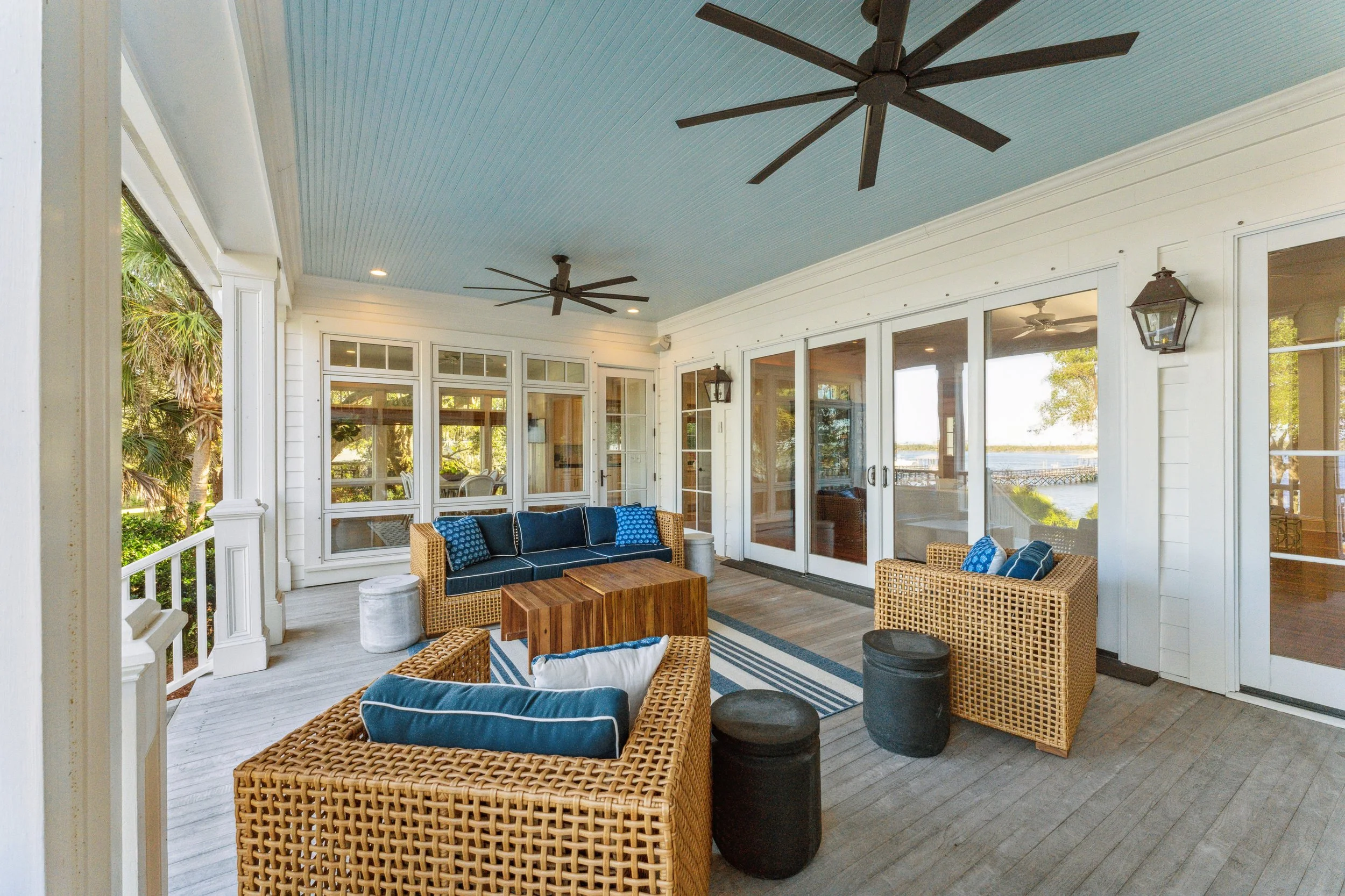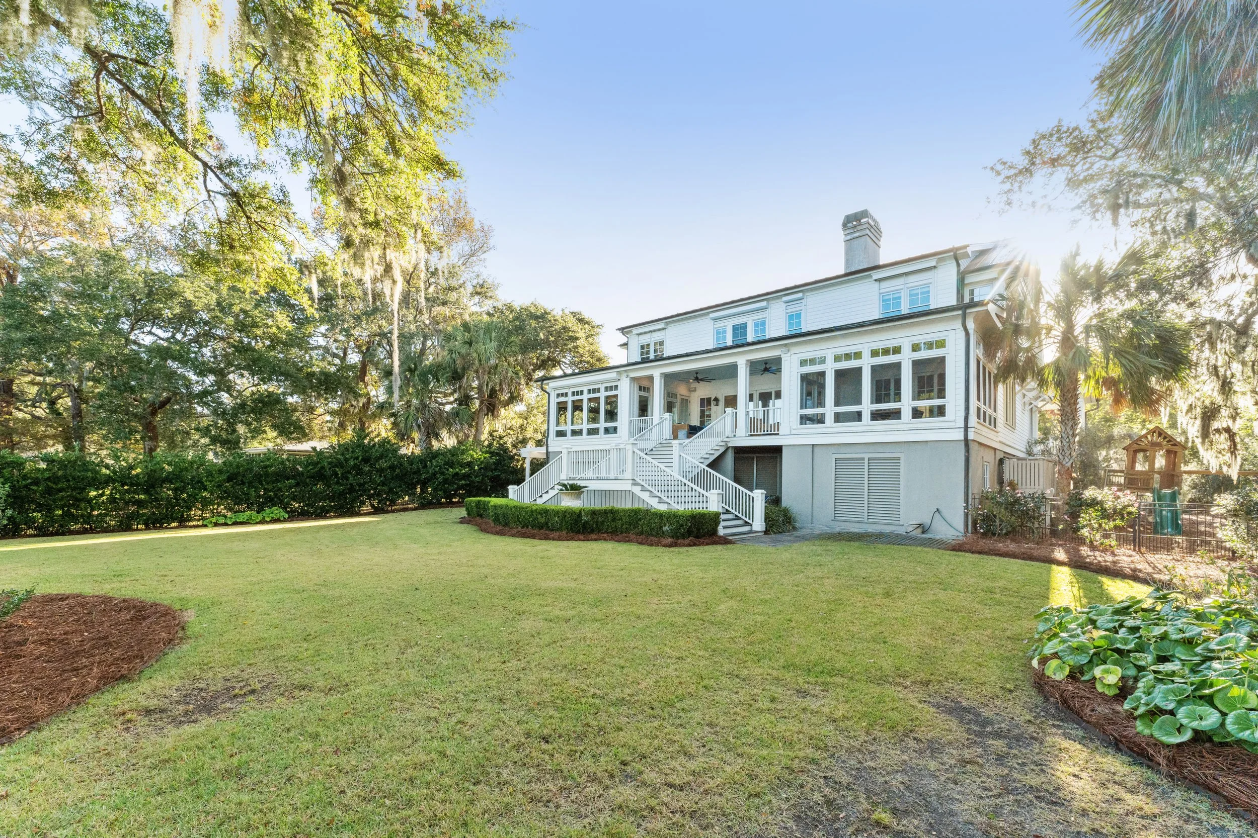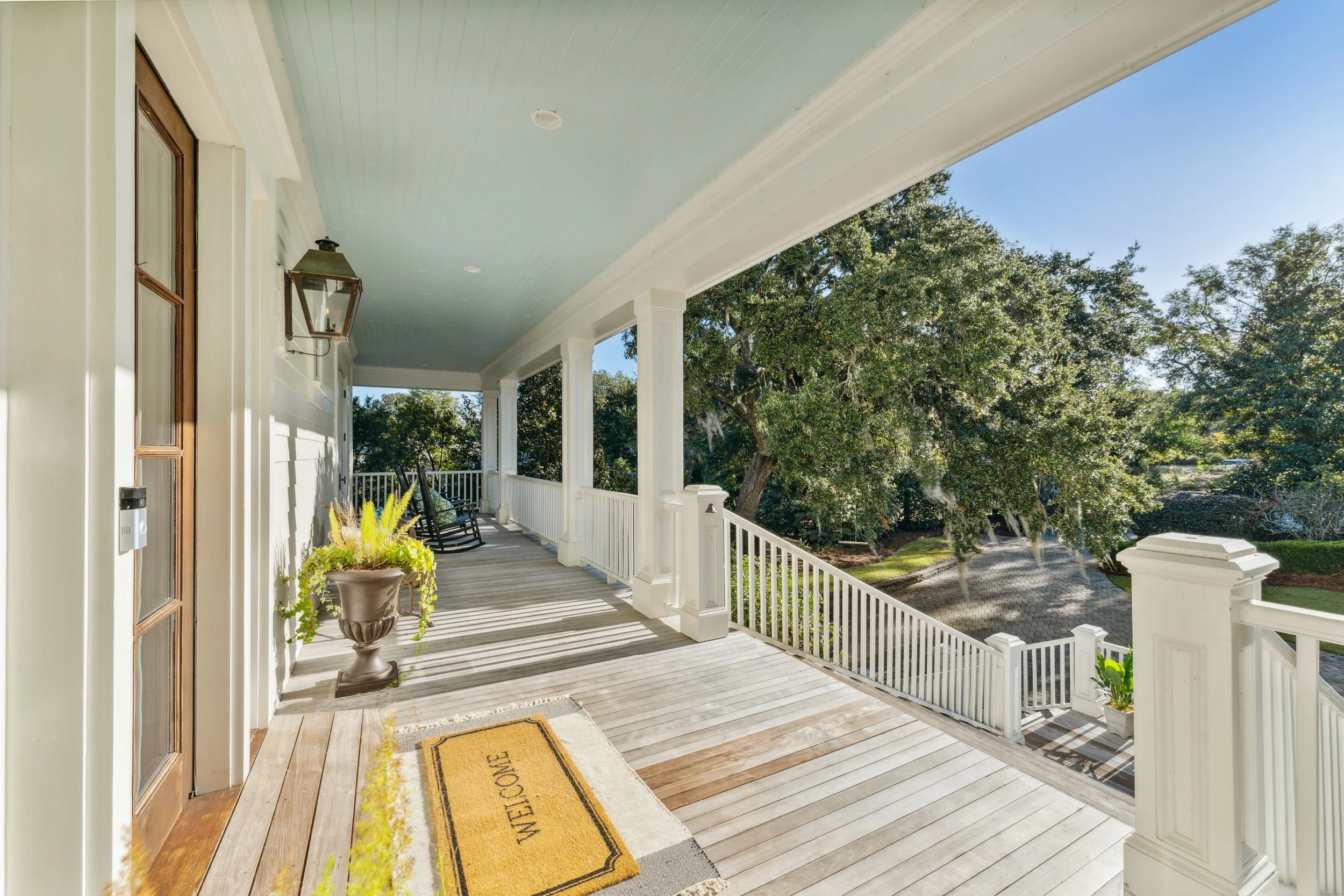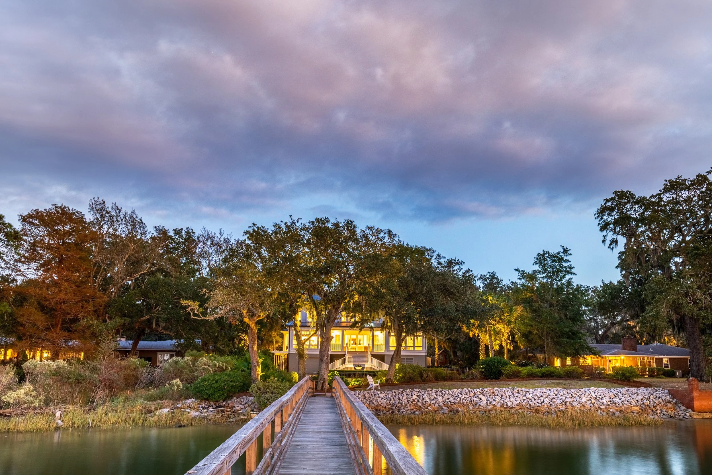 This 5,600+ square foot home features over 80 feet of waterfront on its lot and has a DEEP WATER DOCK! You are greeted by a large circle driveway and mature oak trees - true Lowcountry charm. The large wrap-around front porch is the perfect place to enjoy a porch swing or rocking chairs. The foyer is grand and leads to the living room with water views. Large sliding doors from the living room lead to the large back porch where the water views really shine! The main level also features a spacious kitchen with ample storage, a casual dining room, a formal dining room, a bedroom with an ensuite, and an office. Upstairs you will find the primary suite, 2 more bedrooms, a laundry room, and a bonus room that can be a media room or 5th bedroom. All the bedrooms and the laundry room are a generous size. The ground level contains a HUGE GARAGE that has room for cars, golf carts, paddle boards, ping pong, and MORE!
