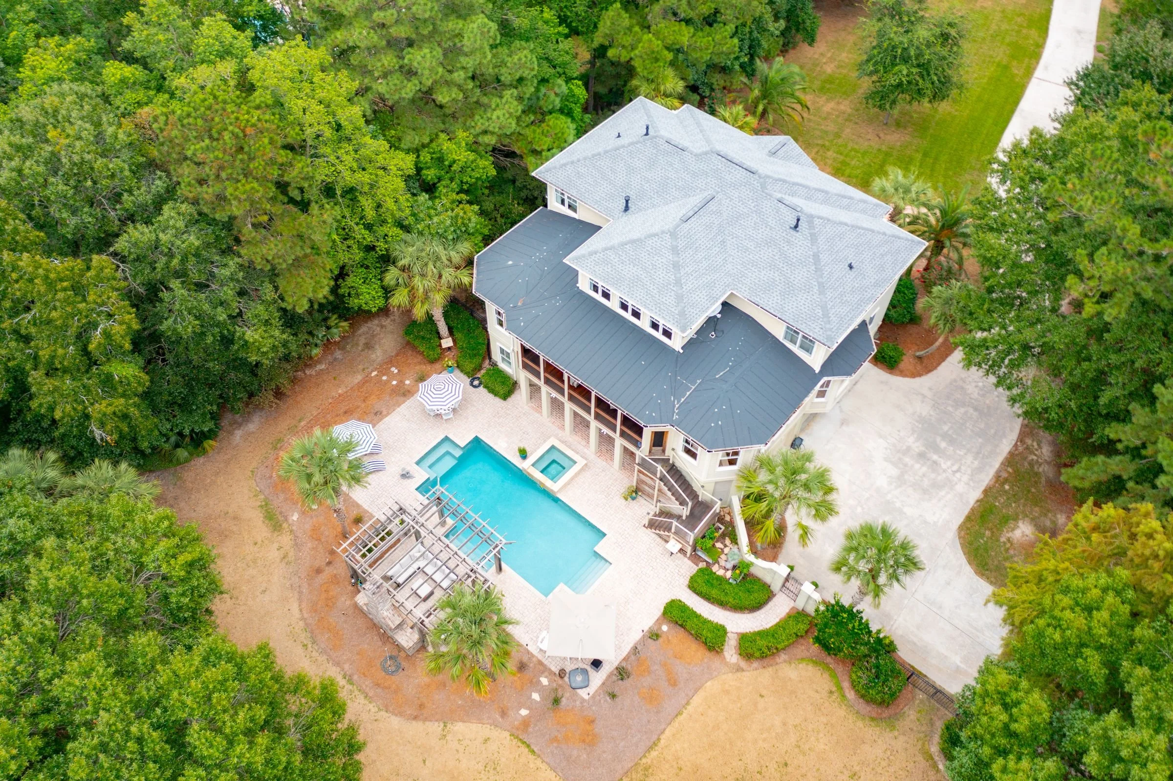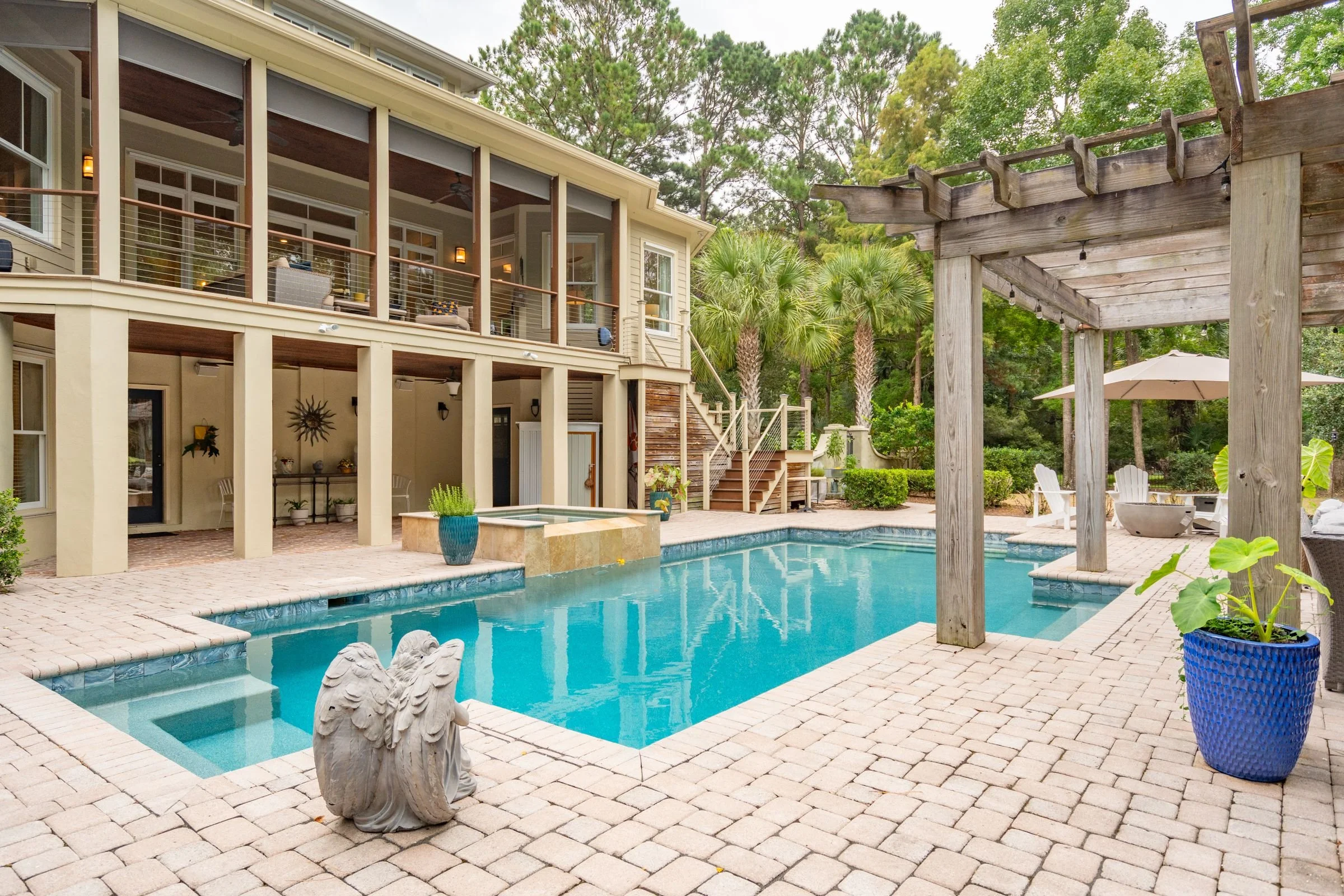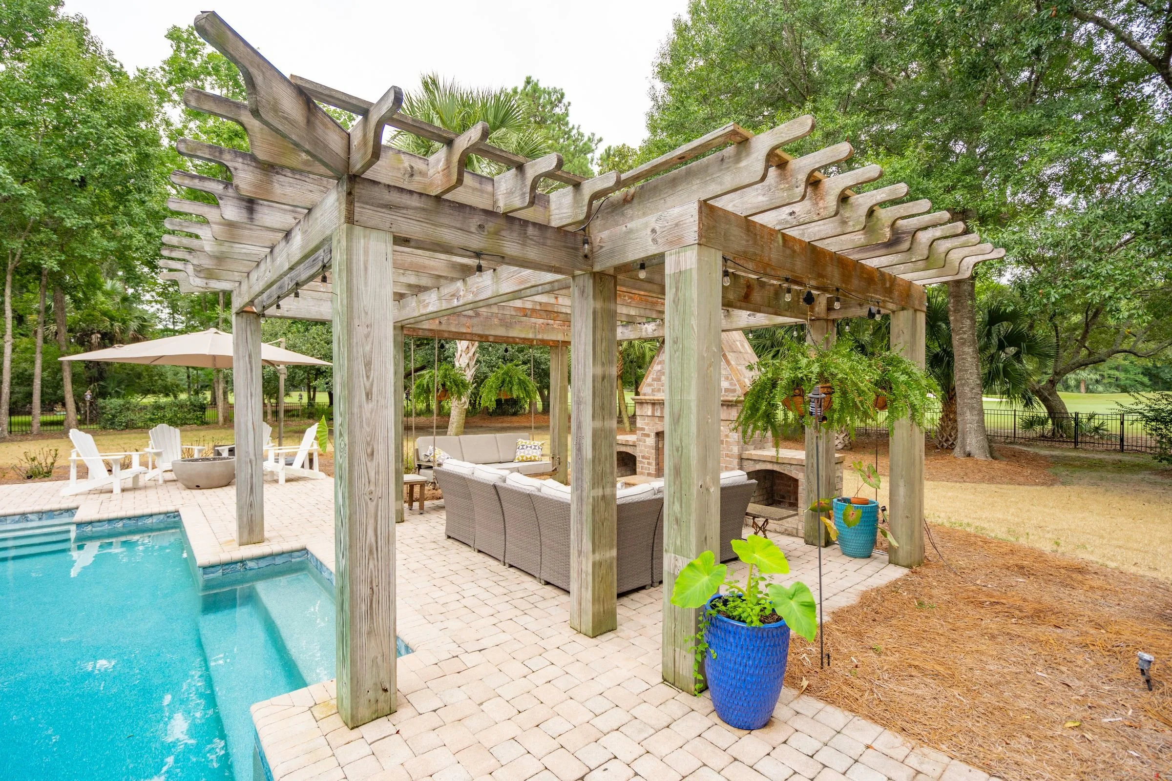 The outdoor living spaces of this home made for the Lowcountry lifestyle. The backyard features a sparkling heated pool and a charming seating area beneath a pergola with a brick wood-burning fireplace, adding a touch of rustic elegance. Wide porches grace both the front and rear of the home, providing ample space to savor the outdoors and take in the beautiful surroundings.