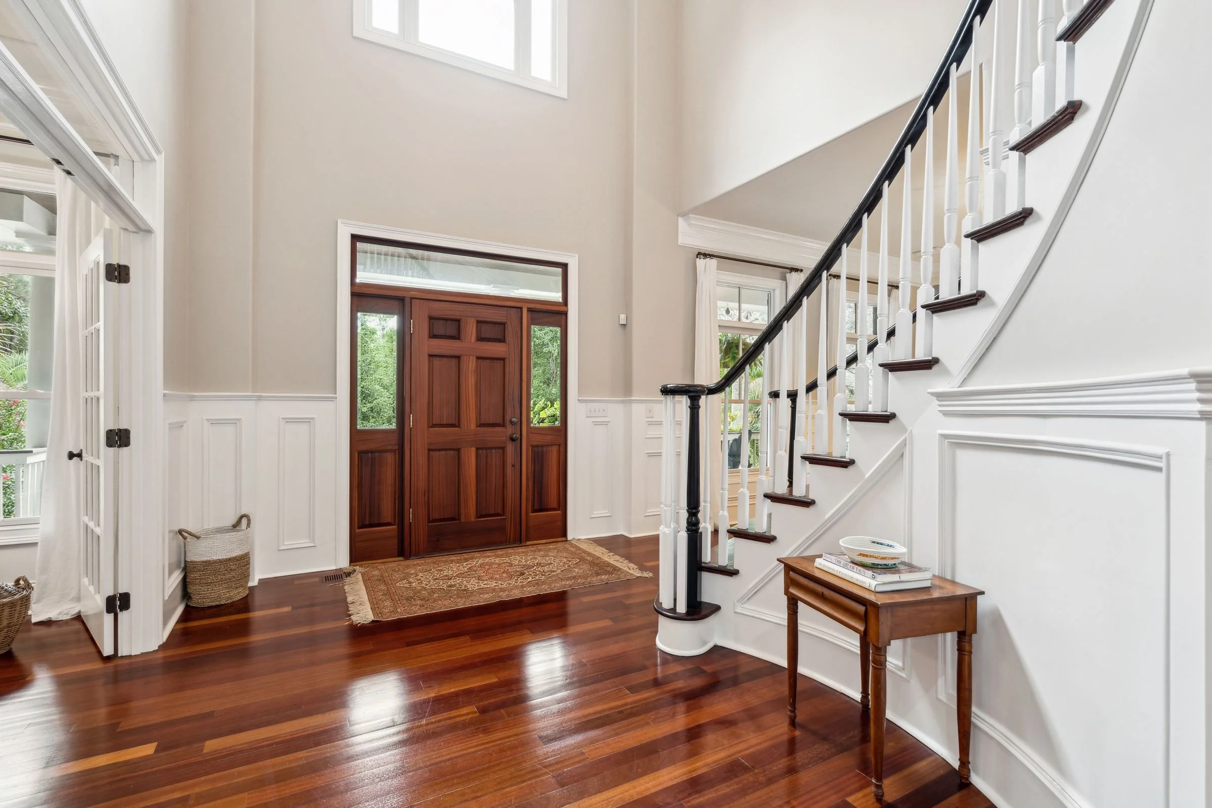 Throughout the first and second level of the home, rich Brazilian Cherry hardwood floors add a touch of luxury and warmth, enhancing the inviting atmosphere.