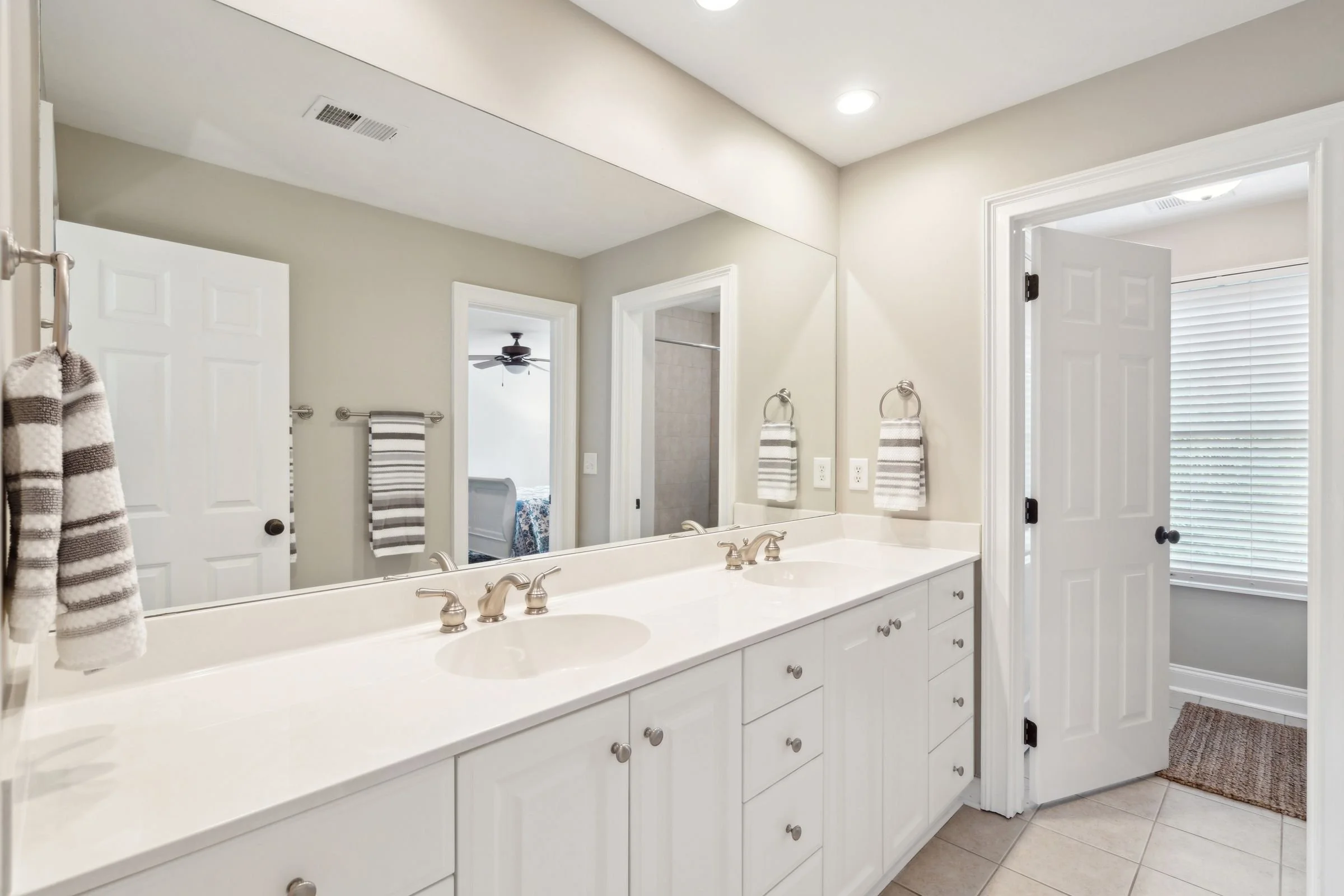 Upstairs, the home continues to impress with a spacious bonus room, complete with a built-in projector, making it the perfect spot for cozy movie nights. The second level also includes four well-appointed bedrooms, thoughtfully arranged with two on each side of the home. Each pair of bedrooms is connected by a Jack and Jill bathroom, ensuring both privacy and convenience. All bedrooms feature their own walk-in closets, providing ample storage space for the entire family.