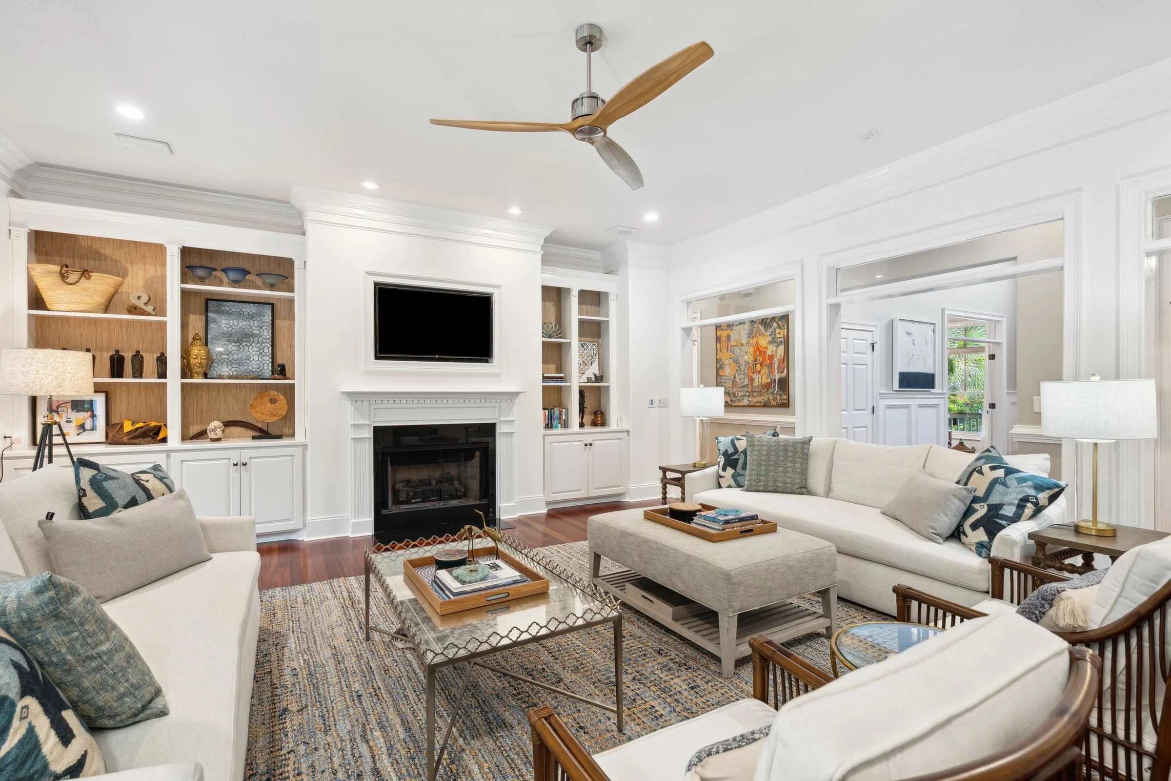 The expansive living room is a central feature of the home, offering built-in shelving and a wet bar for effortless entertaining.