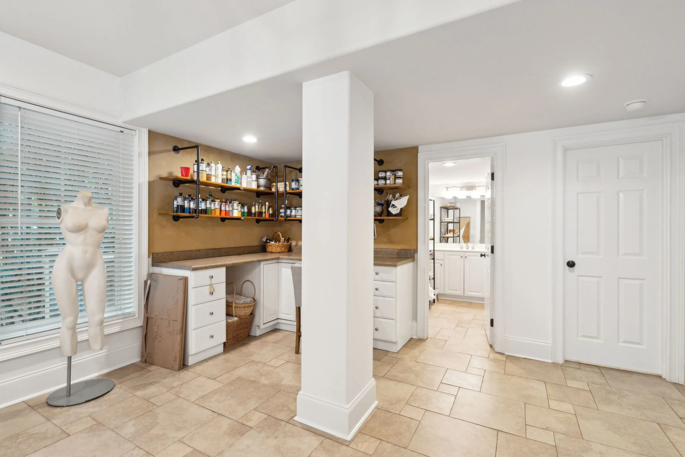 Descending to the ground level, you'll find a three-car garage. This level also features multiple temperature-controlled storage areas, perfect for preserving delicate items or organizing seasonal belongings. For added convenience and versatility, there is a kitchenette and an ensuite bedroom that could serve as an artist’s studio, a mother-in-law suite, or a private guest retreat. A covered patio extends from this level, providing seamless access to the pool area, where you can relax and enjoy the spacious backyard that backs up to the lush golf course.