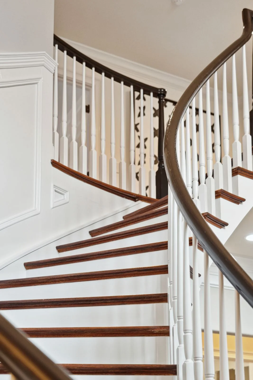As you step into this elegant home, you'll be greeted by a bright and airy vaulted entry, showcasing a striking curved staircase with intricate trim details. The entry also provides convenient access to the elevator that services all floors, ensuring ease of movement throughout the home.