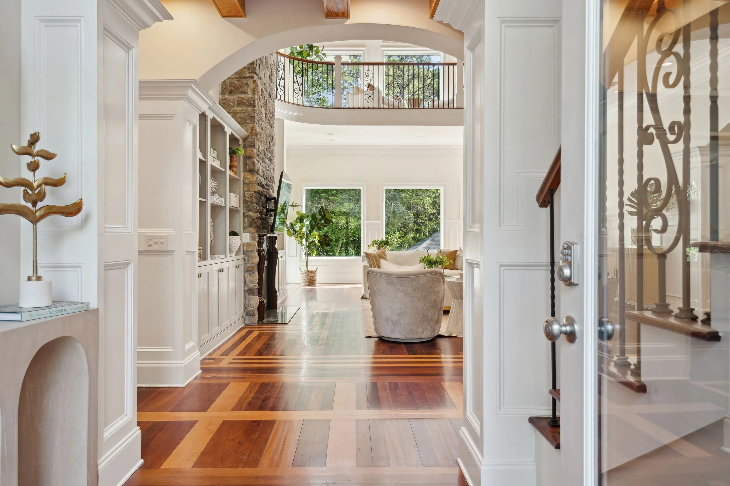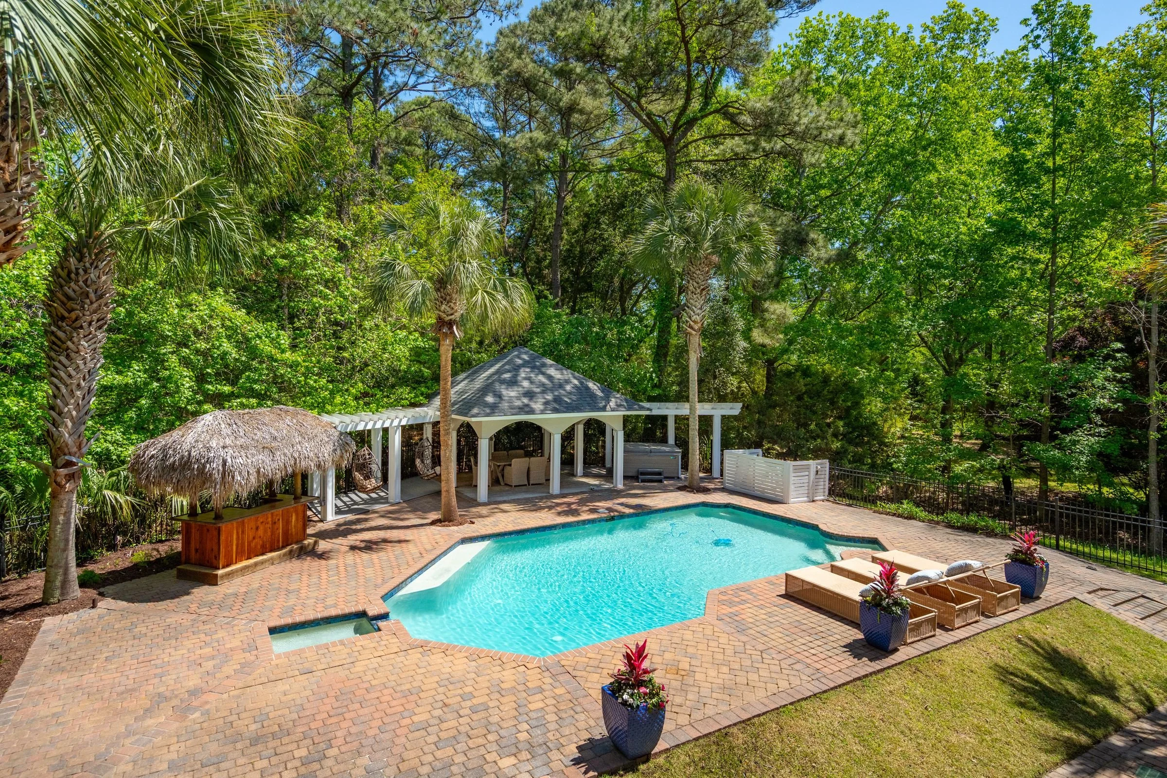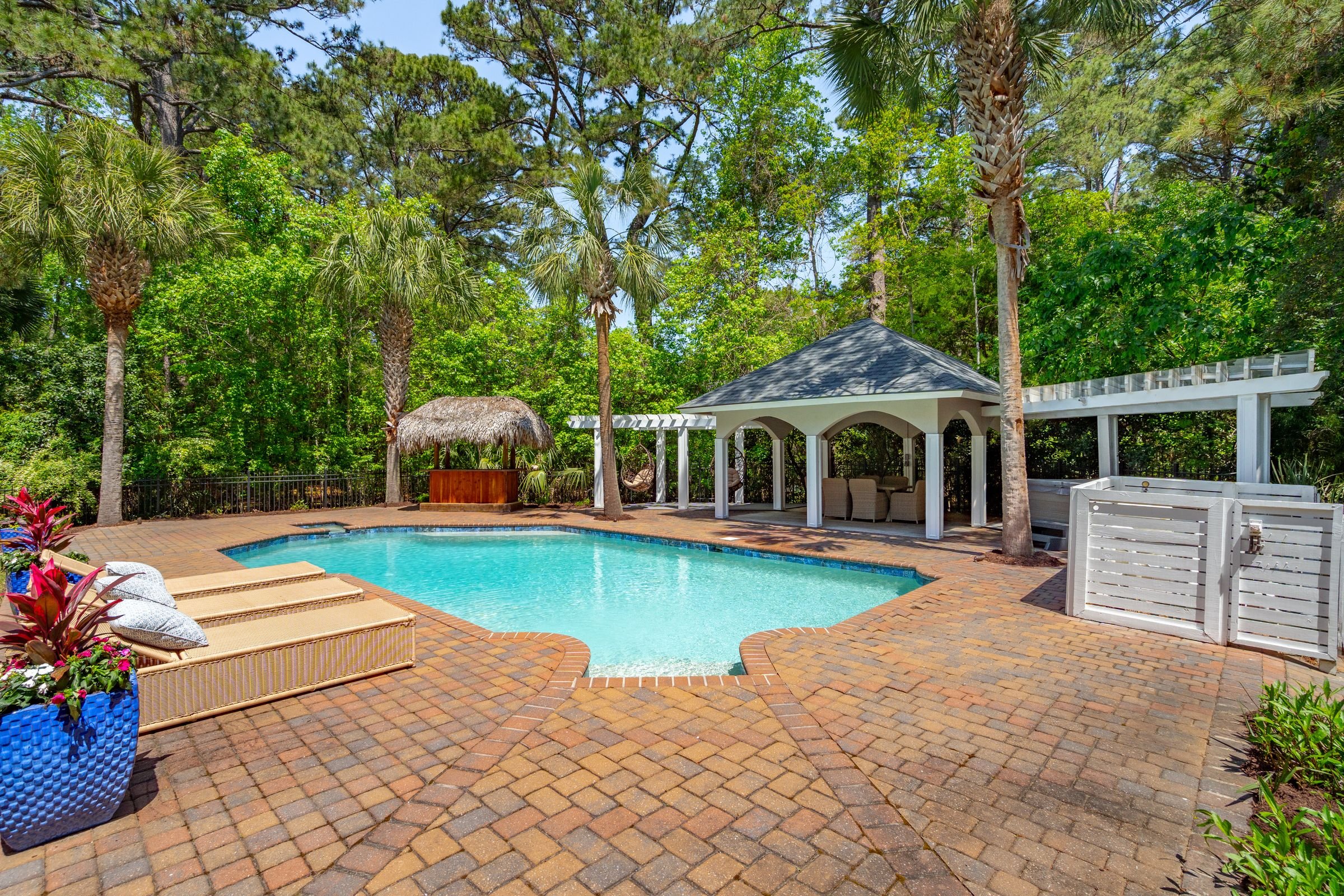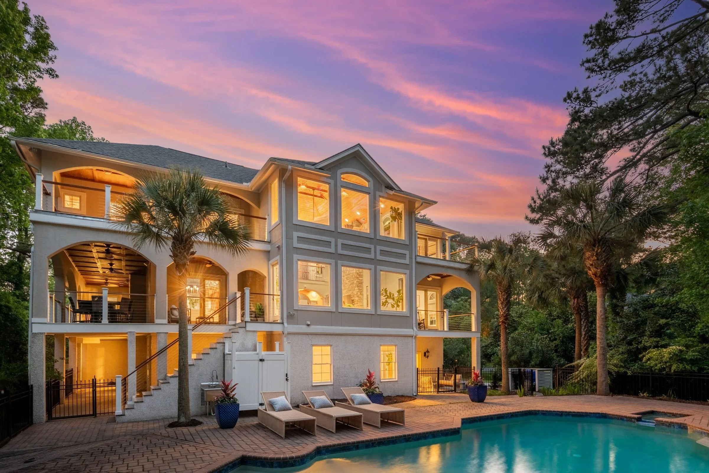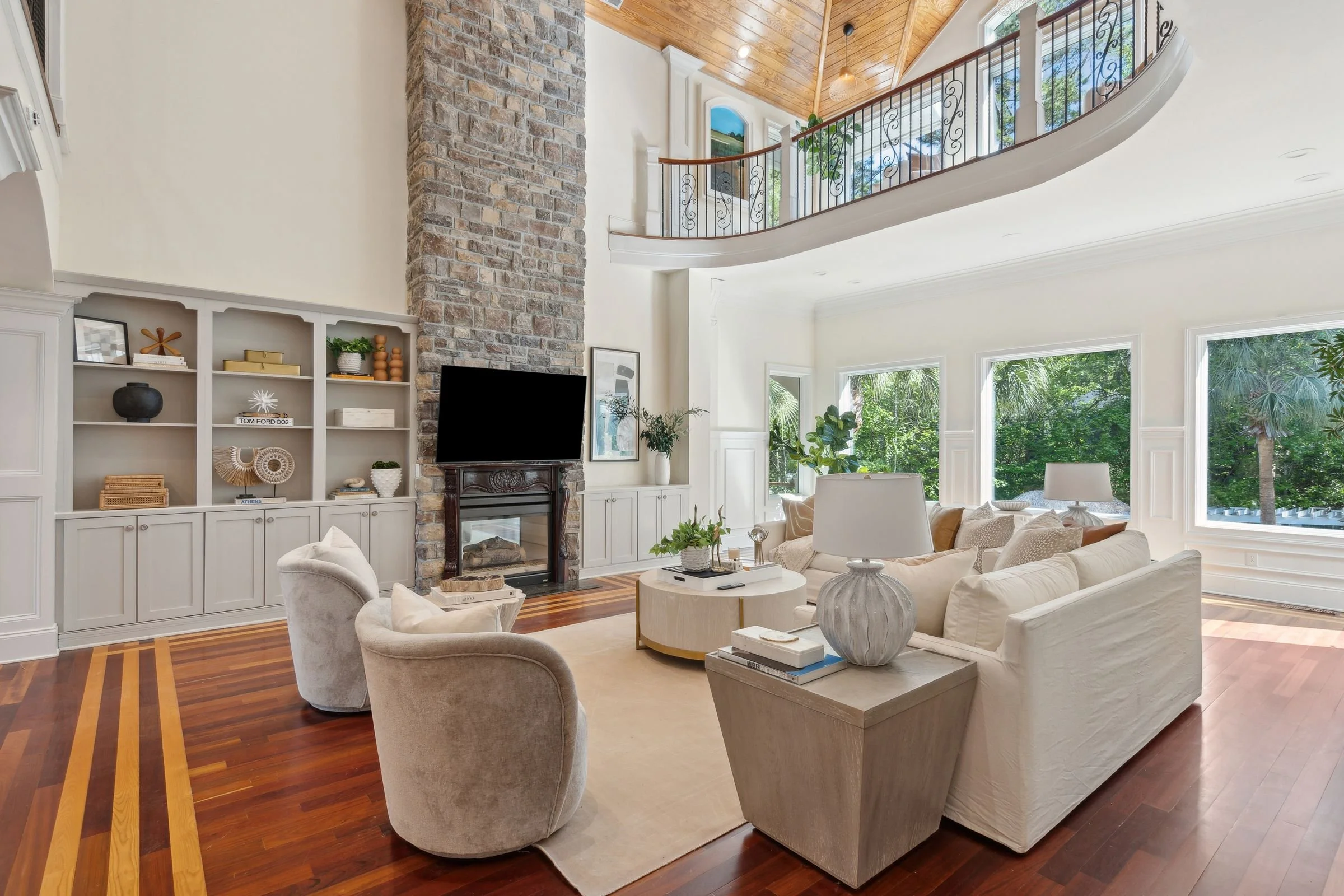 Welcome to 4952 Steeplechase Lane, a stunning retreat nestled in the gated community of Stono Ferry. Tucked away on a quiet cul-de-sac, this exceptional home sits on nearly an acre of beautifully landscaped grounds and offers an ideal blend of luxury, comfort, and privacy. Step inside to find warm wood floors and soaring vaulted ceilings that create a grand, inviting atmosphere. Expansive windows along the back of the home frame picturesque views of the saltwater heated pool and cabana, making every day feel like a resort getaway. The main level features a gourmet kitchen equipped with top-of-the-line Wolf and Sub-Zero appliances—perfect for culinary enthusiasts.