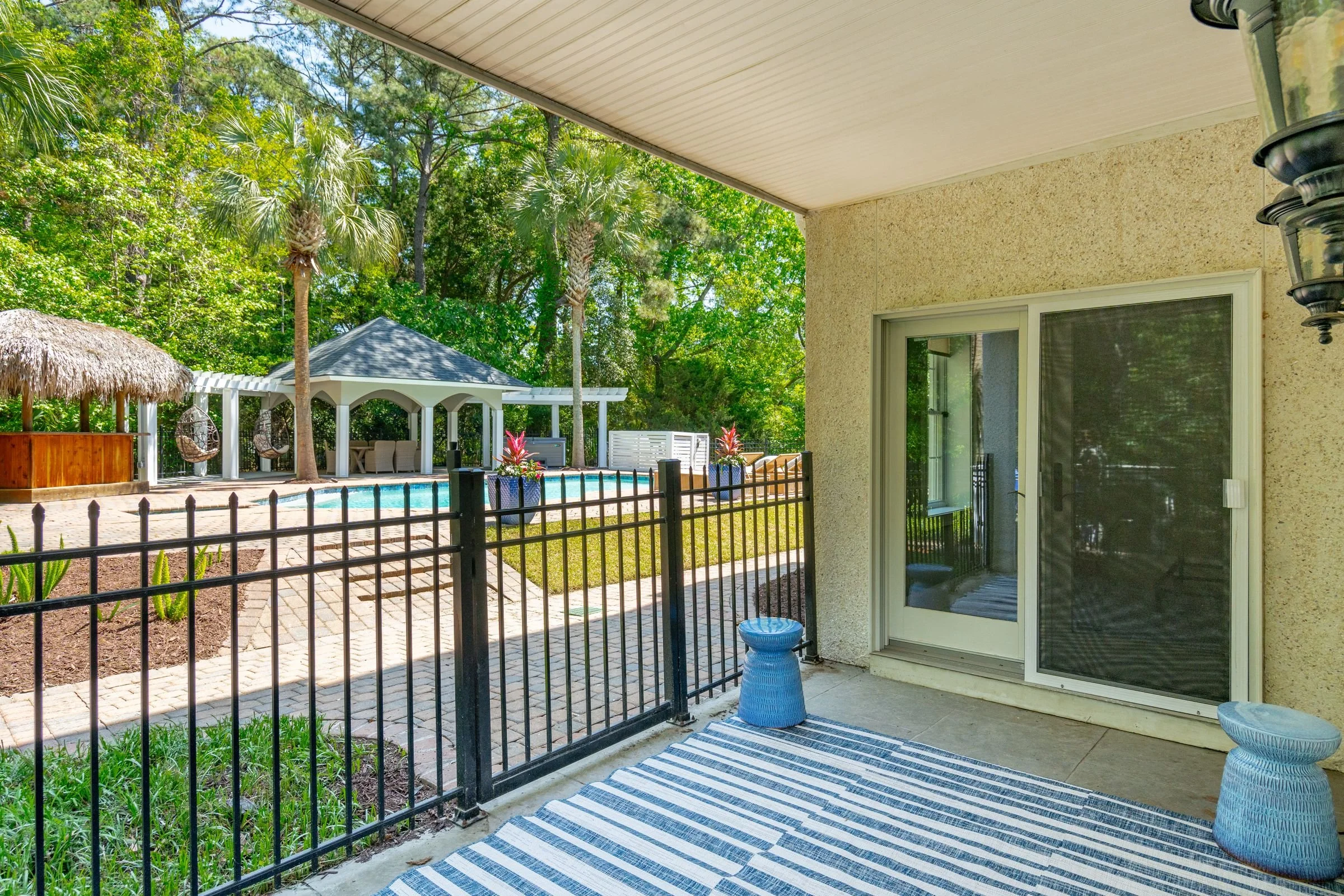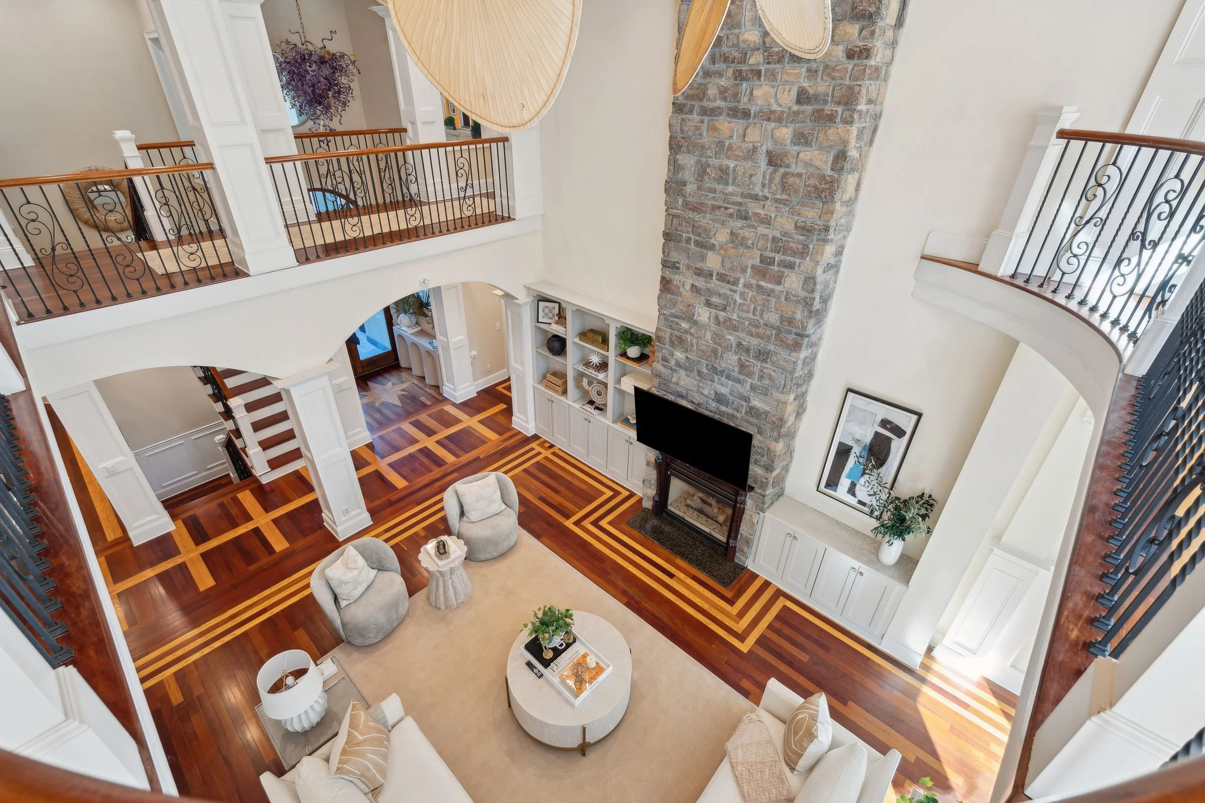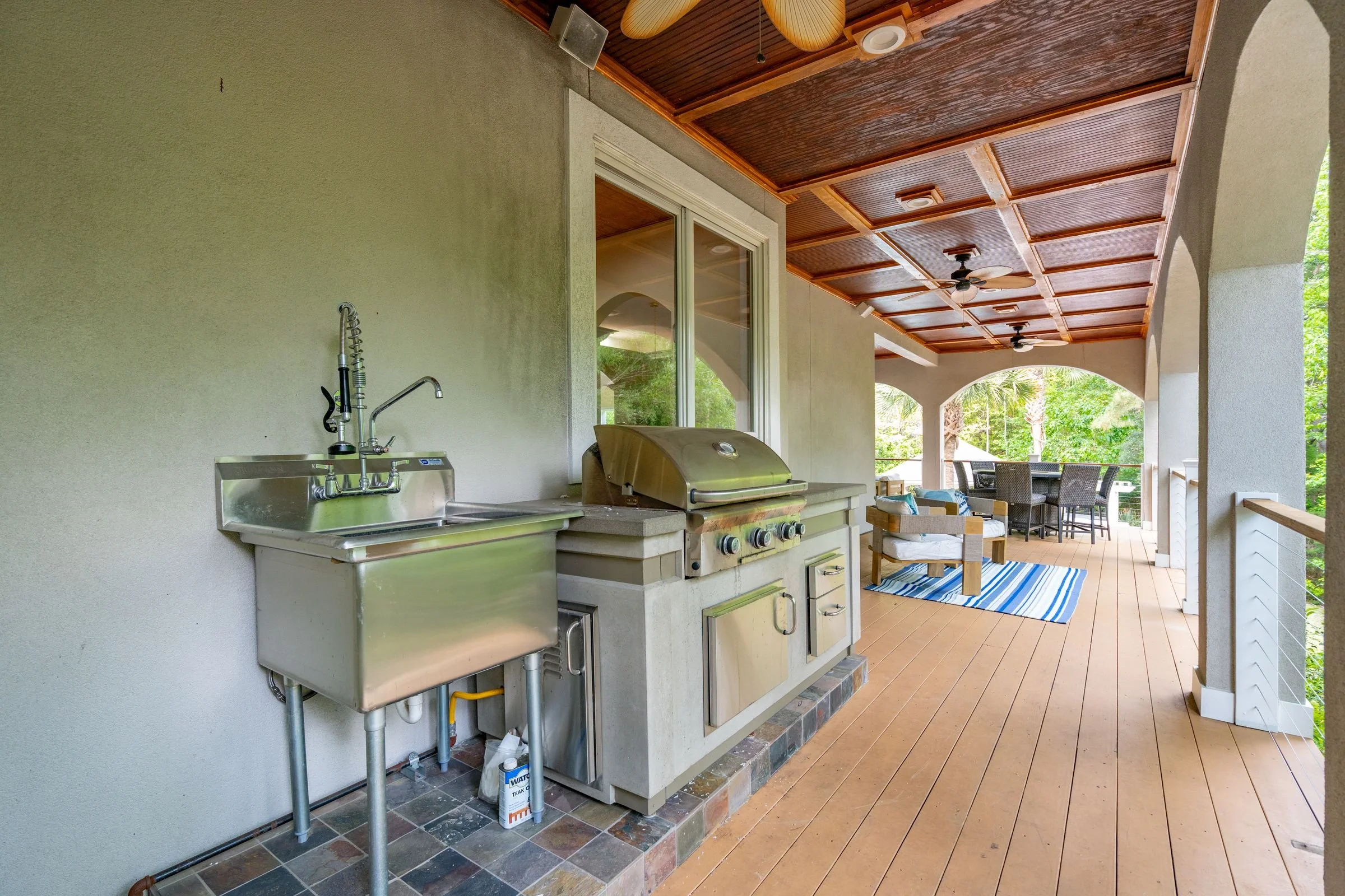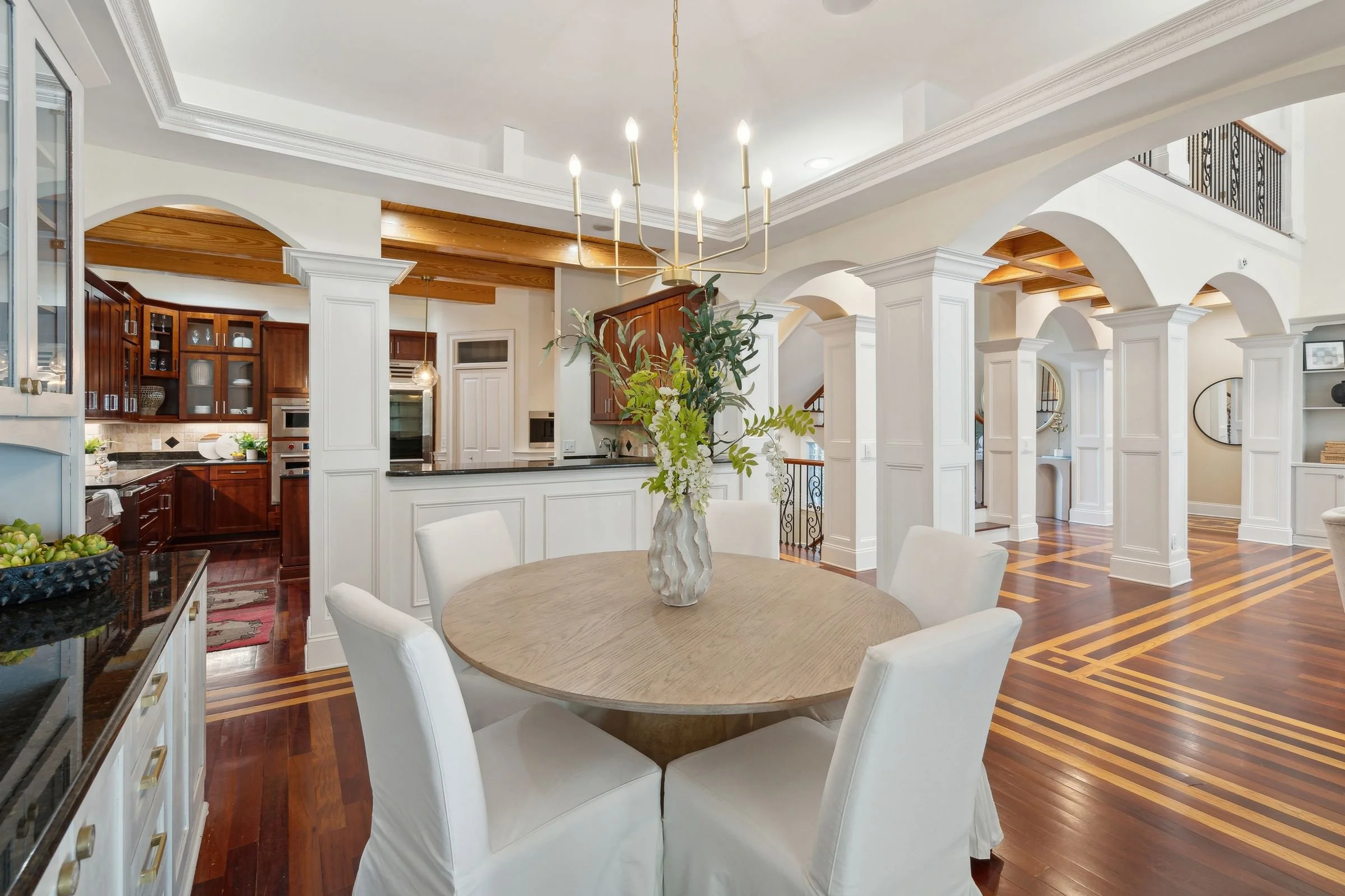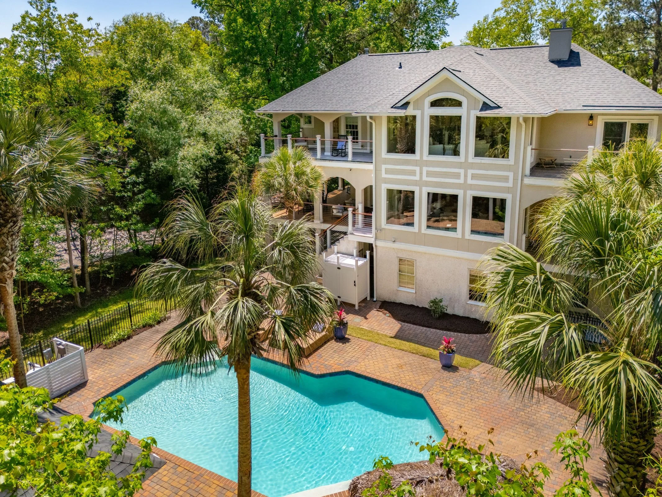 Welcome to 4952 Steeplechase Lane, a stunning retreat nestled in the gated community of Stono Ferry. Tucked away on a quiet cul-de-sac, this exceptional home sits on nearly an acre of beautifully landscaped grounds and offers an ideal blend of luxury, comfort, and privacy. Step inside to find warm wood floors and soaring vaulted ceilings that create a grand, inviting atmosphere. Expansive windows along the back of the home frame picturesque views of the saltwater heated pool and cabana, making every day feel like a resort getaway. The main level features a gourmet kitchen equipped with top-of-the-line Wolf and Sub-Zero appliances—perfect for culinary enthusiasts.