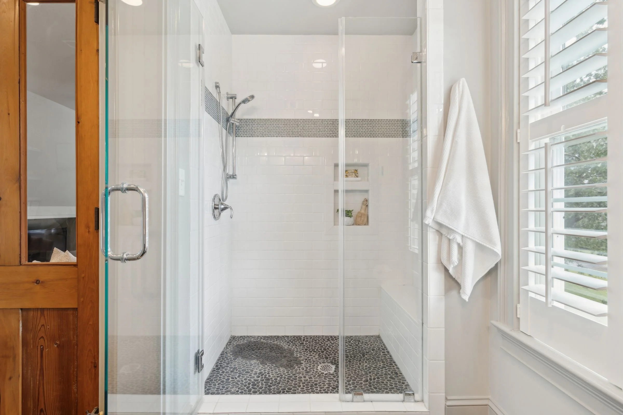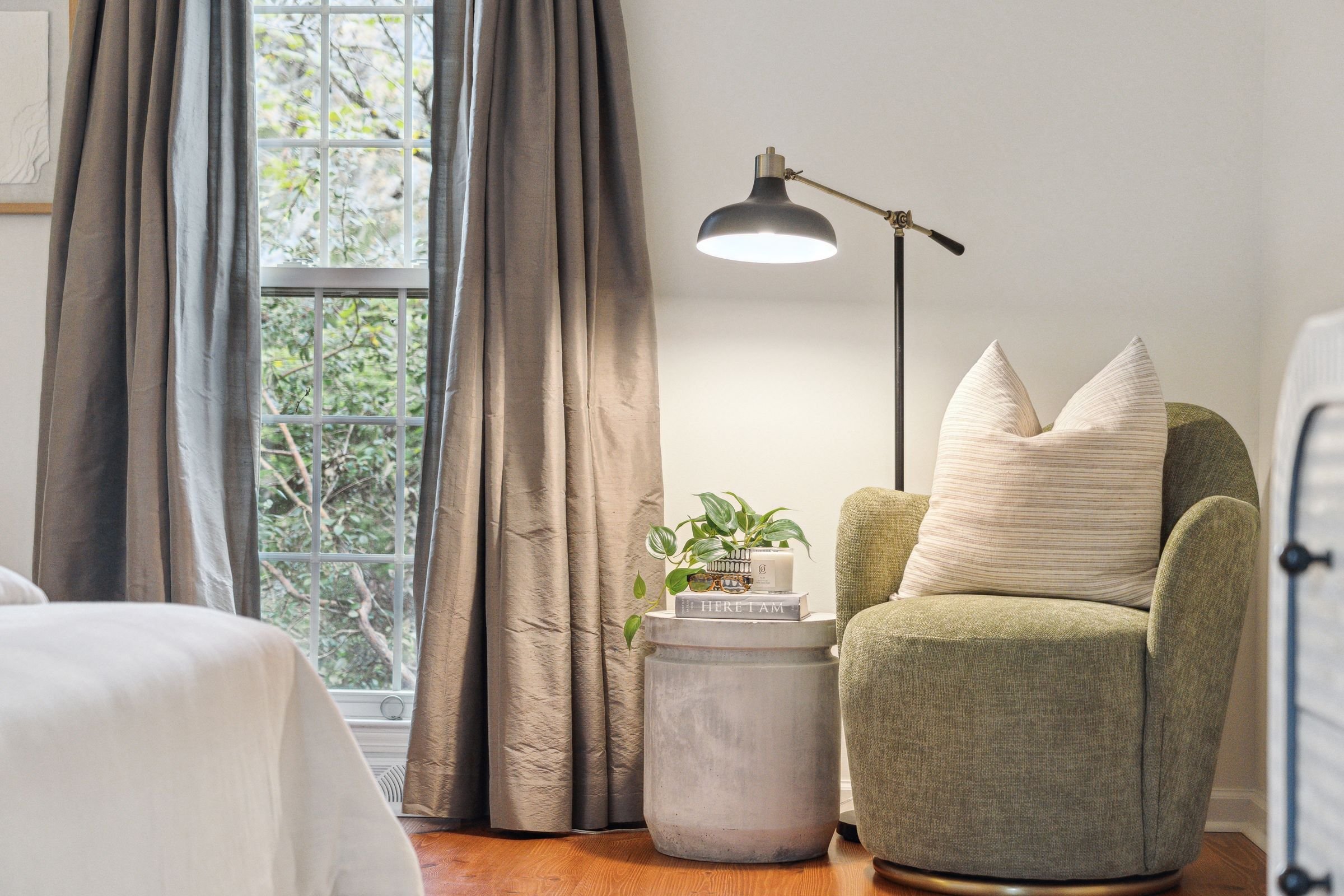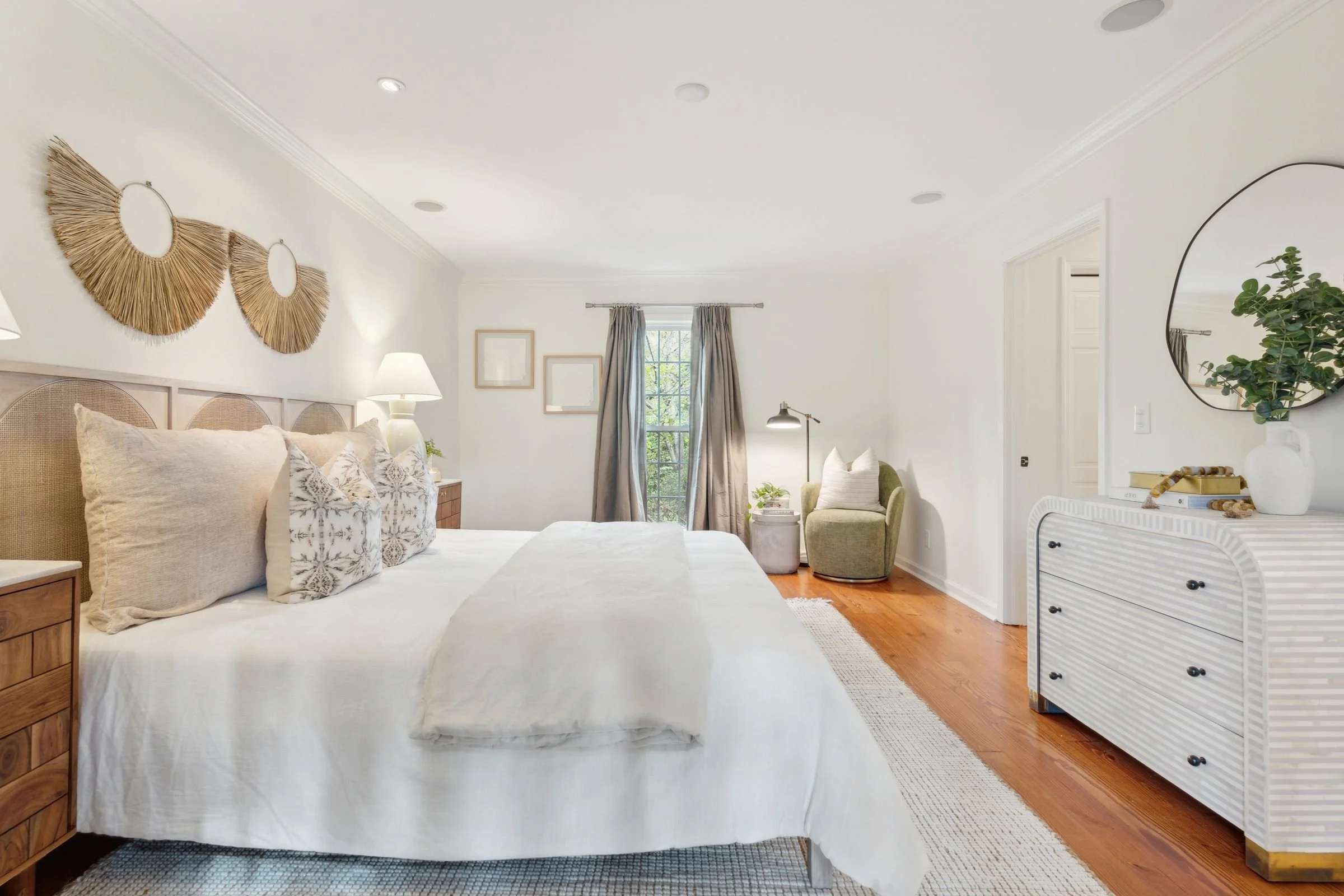 The primary bedroom suite, located on the main floor at the rear of the home, is a peaceful retreat with marsh views and an abundance of natural light. This spacious bedroom offers a quiet sanctuary, while the newly renovated en-suite bathroom is a luxurious escape with dual vanities, a walk-in shower, and elegant tilework.