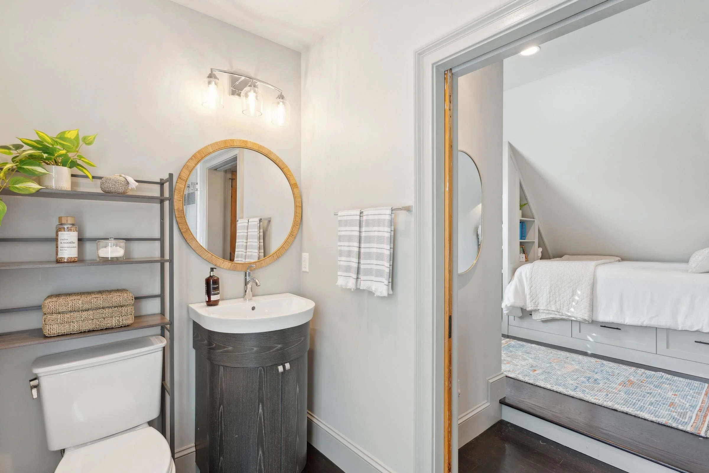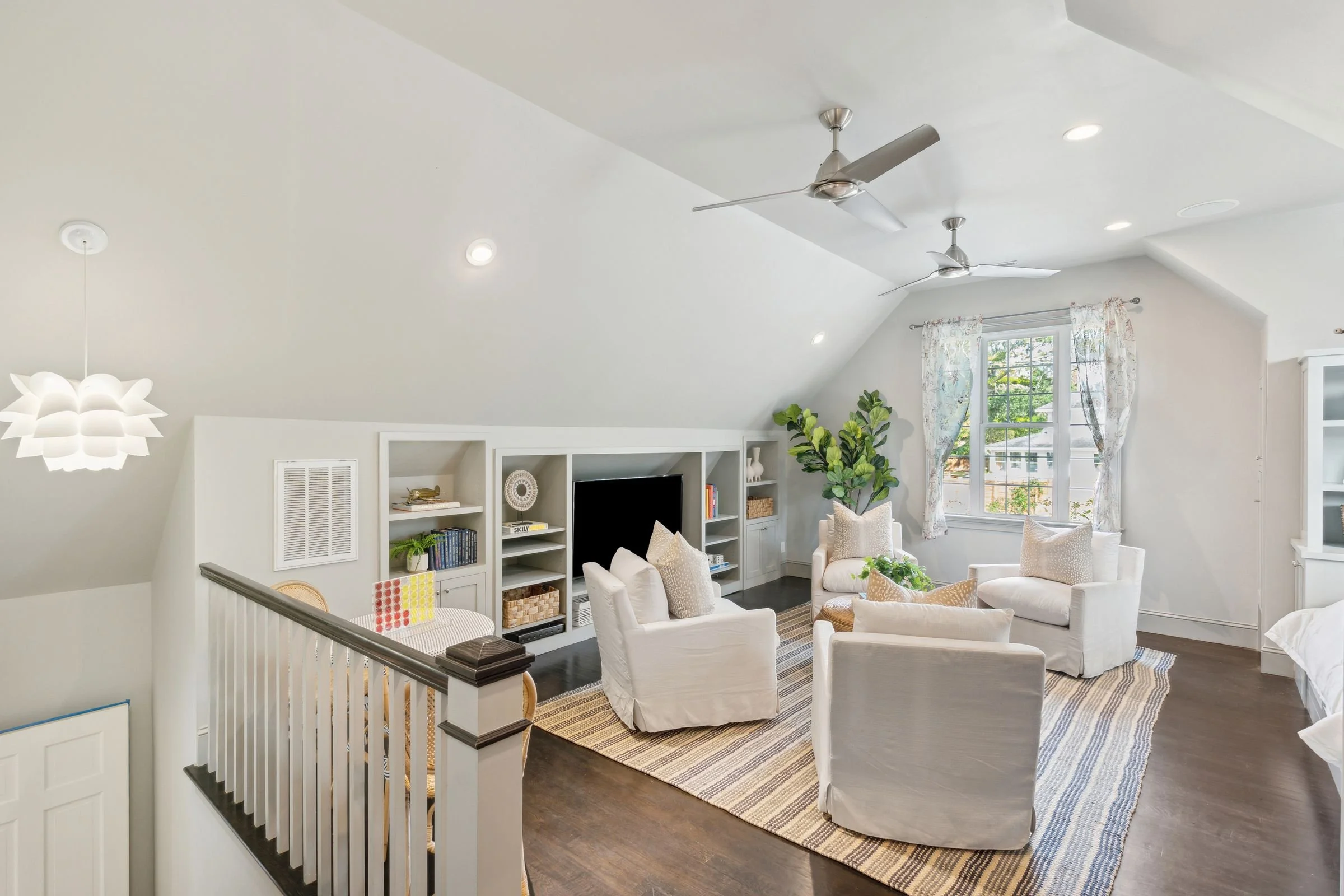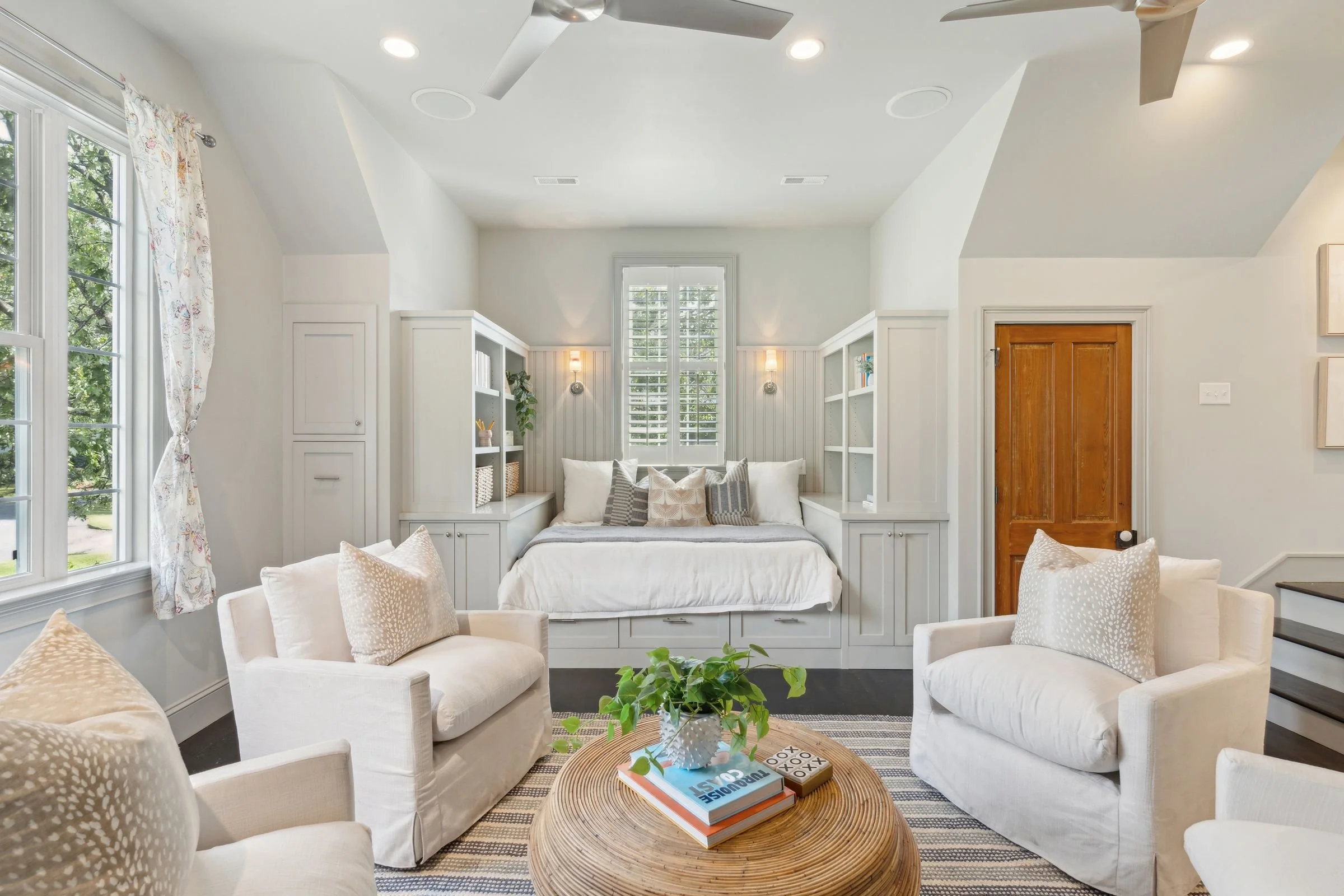 For even more space, head to the room over the garage, which is accessed by a private staircase. This large, versatile room is perfect for entertaining or hosting guests. Complete with built-in shelving and wired for speakers, it offers plenty of space for a game night, a dance party, or even a home theater. An additional nook off of the main room serves as a cozy bedroom, complete with a built-in bed, and is connected to a full bath, offering both privacy and comfort for guests.