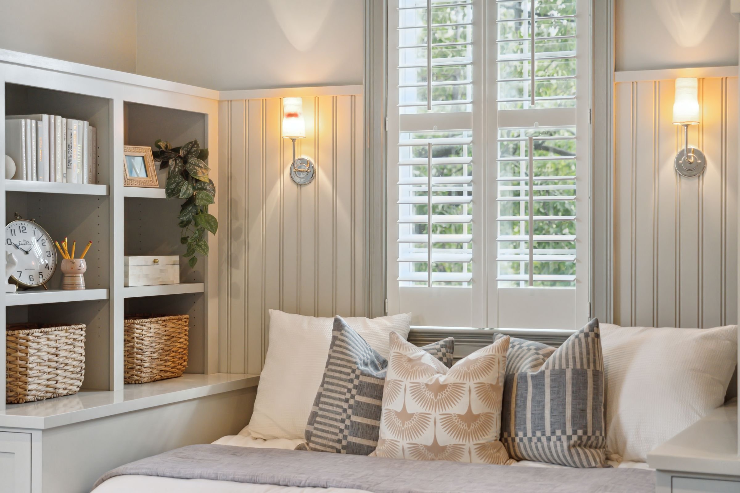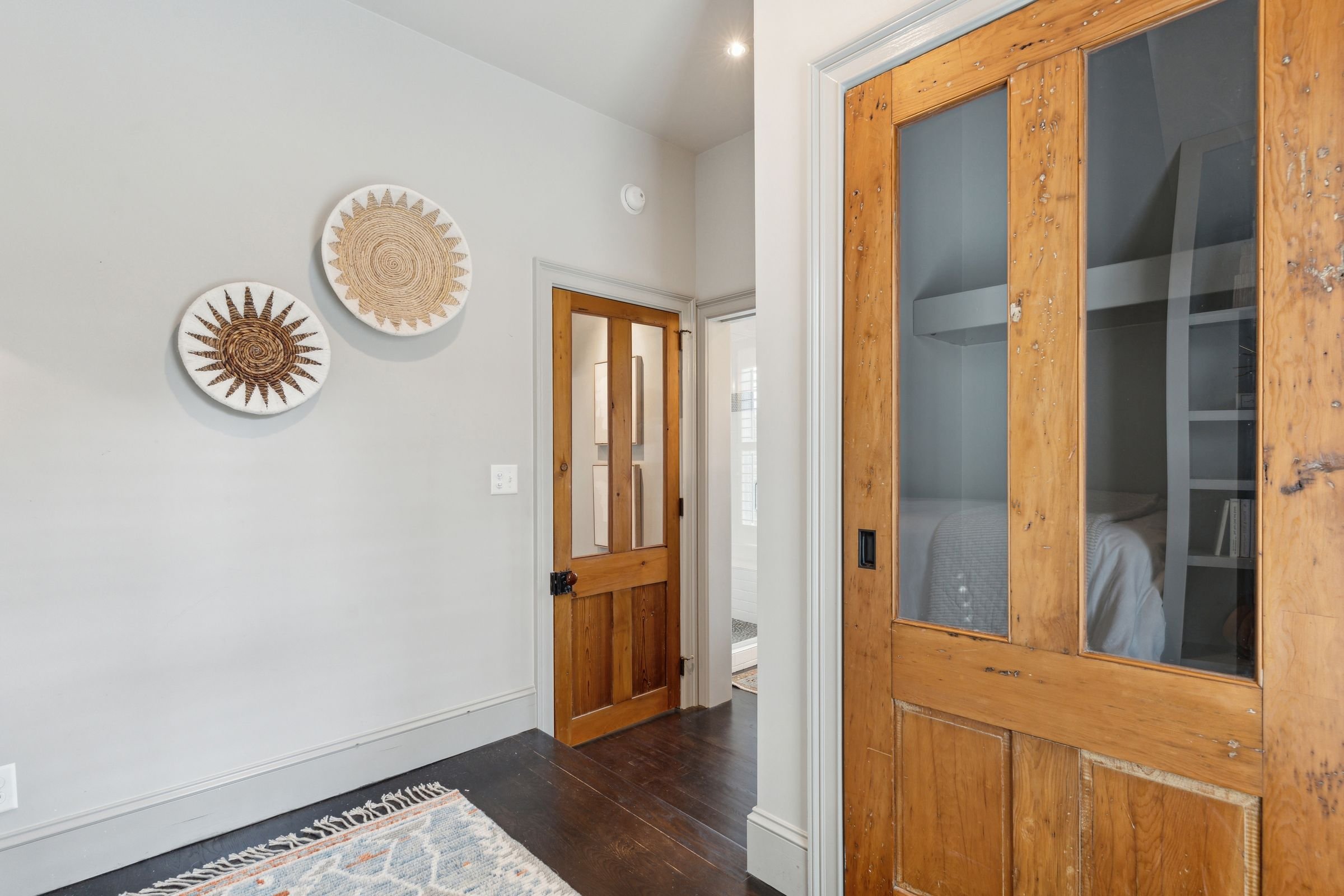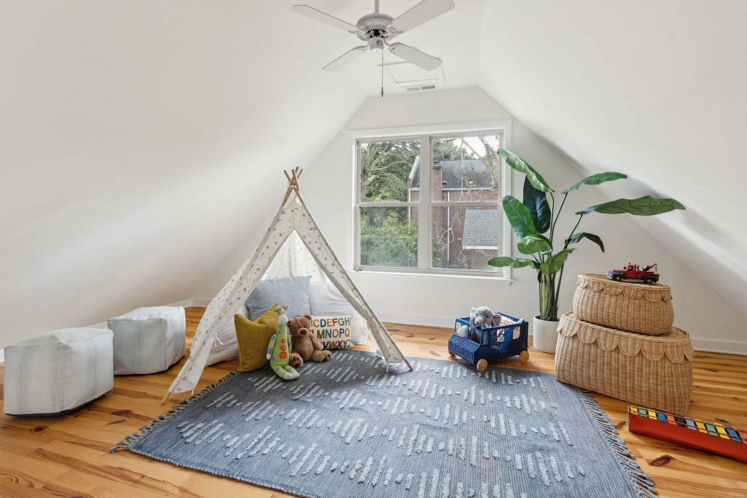 For even more space, head to the room over the garage, which is accessed by a private staircase. This large, versatile room is perfect for entertaining or hosting guests. Complete with built-in shelving and wired for speakers, it offers plenty of space for a game night, a dance party, or even a home theater. An additional nook off of the main room serves as a cozy bedroom, complete with a built-in bed, and is connected to a full bath, offering both privacy and comfort for guests.
