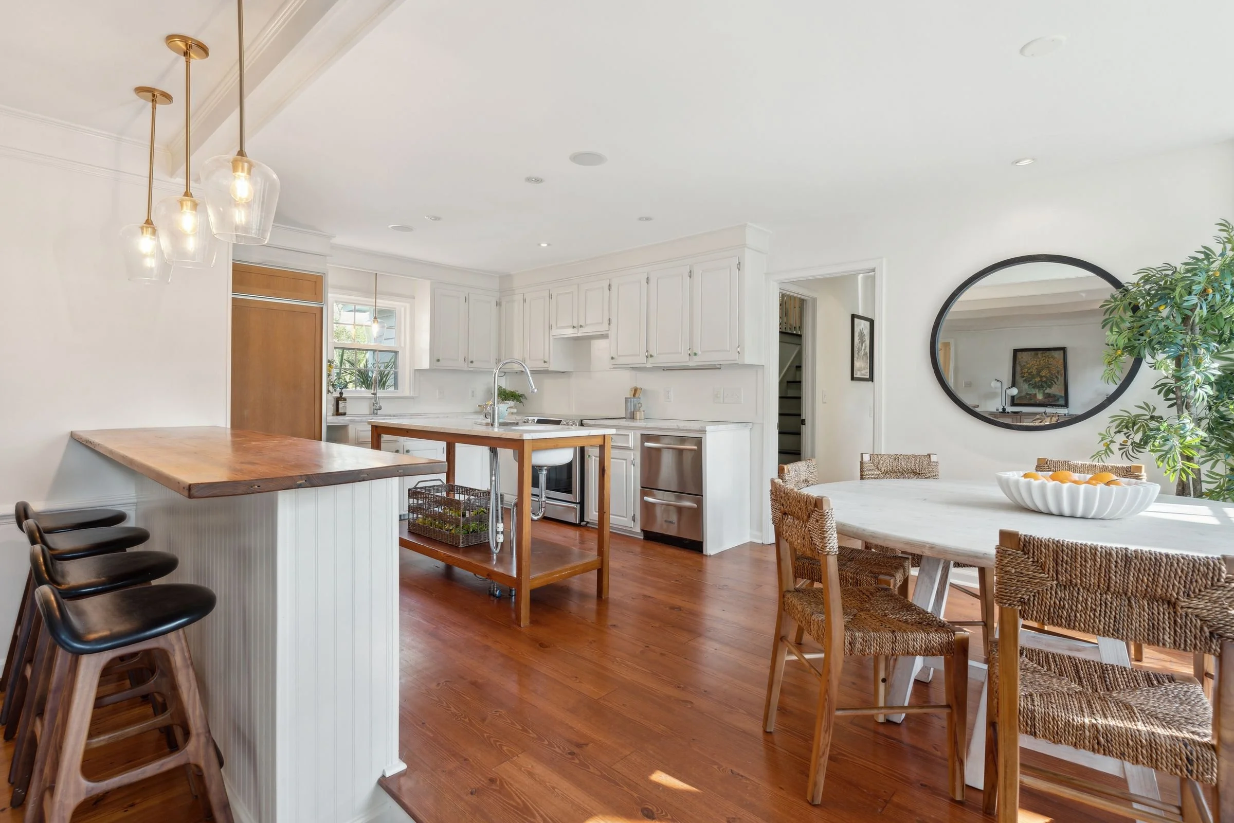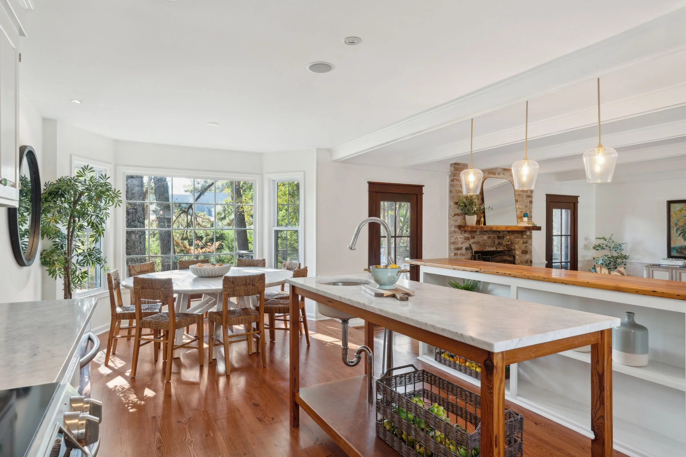 The main floor flows effortlessly. The downstairs includes a spacious office, perfect for remote work or quiet reflection. An elegant dining room offers ample space for entertaining, while the large gourmet kitchen features marble countertops, an island with prep sink, and top-of-the-line appliances. The expansive eat-in area provides an ideal spot to enjoy your morning coffee while taking in the view of the marsh.
